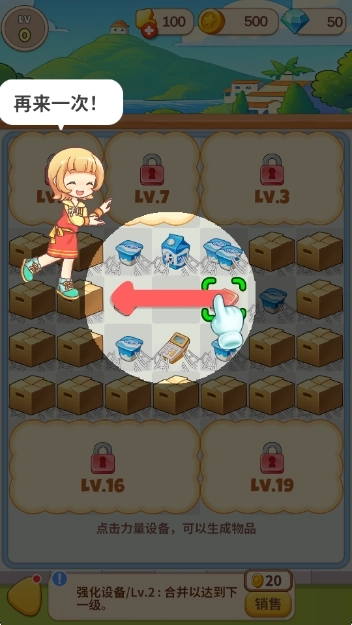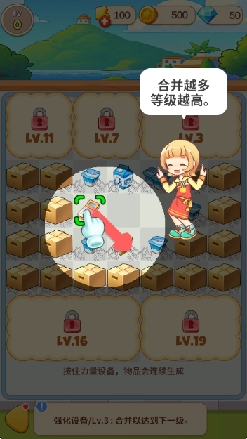 1、操作简单易上手,玩家仅需拖拽合并相同的物品,即可升级获得更高级的物品或建筑。