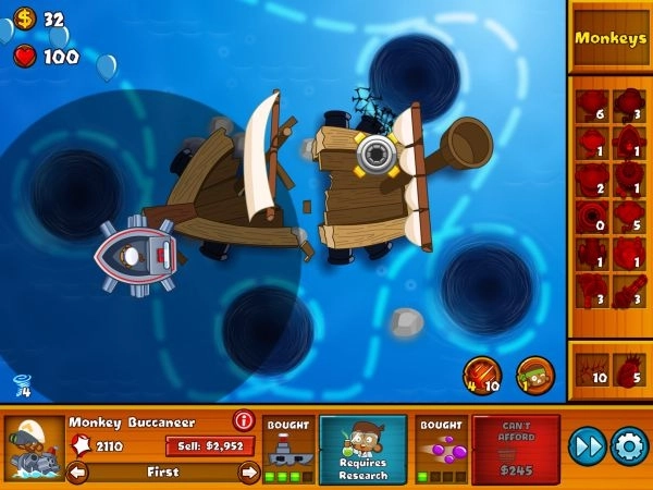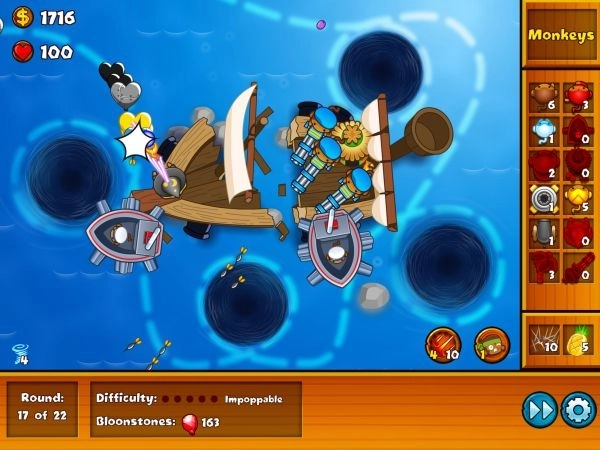 6、先升到3-1再继续升到3-2,接着放置0-2的法师并将其升级到2-2(此时碰到黑白斑马气球就不用开漩涡了,但在放置法师之前遇到铅气球还是得开漩涡,法师要设置为strong模式)(第十波可能会有少量气球漏过去,记得使用第三个漩涡技能)