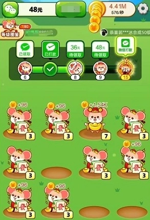 光年游戏新推出的合成赚钱小游戏“鼠你暴富”,玩法和昨天的合成升级类游戏一致。新人初始可能只有0.1元红包,不过前三关每关会赠送10元红包。通过第一关后就能先提现0.1元,后续也可以多玩几关,凑够30元再提现。这家平台的提现规则很友好,0.1元就能起提,而且通过特定关卡还能提升兑换比例。