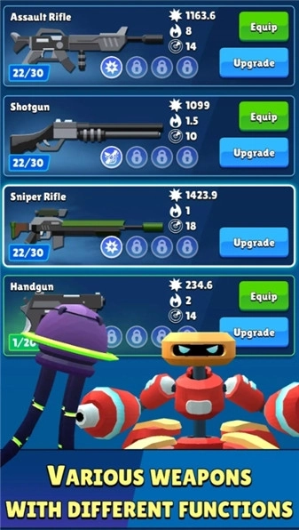 2、武器及技能升级机制,配备多样武器供选择,还能对武器开展升级操作,以此增强其攻击力、射速等各项属性。