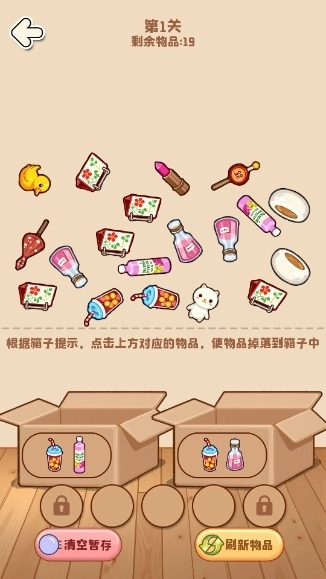 2、按照箱子上的提示,点击上方与之对应的物品,使物品落入箱子内部。