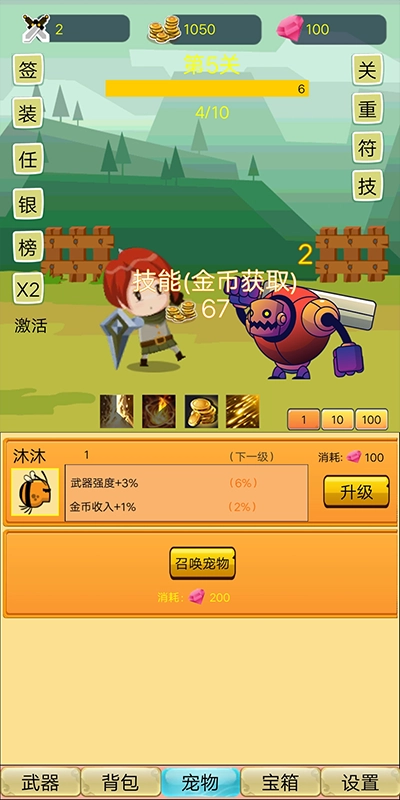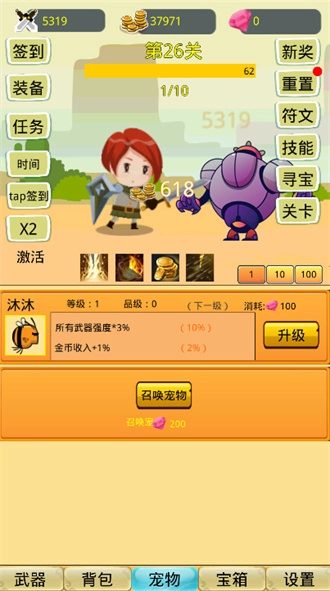 前期先把所有宠物开启,只平均提升带有武器强度属性的宠物等级。