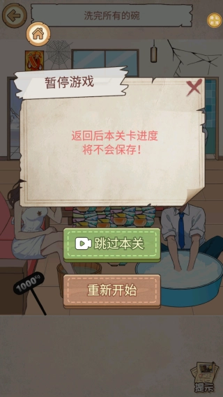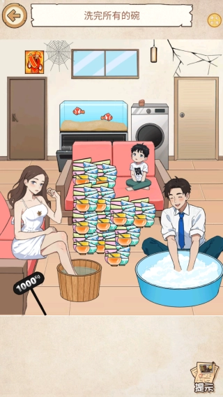 2、完成每一关的任务,把所有碗都洗干净,不要贸然动手,先观察图里的所有物品来获取线索。