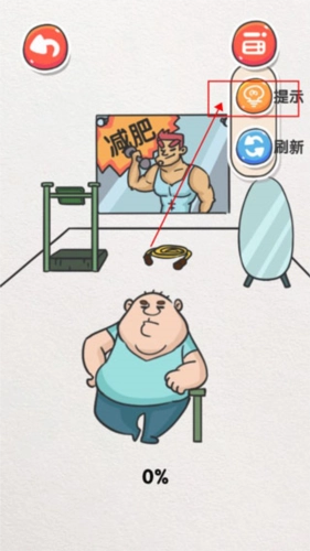 第4关:减肥海报点击后会飘走,下方露出镜子,把镜子摆到胖子面前,上下移动将镜子擦干净,胖子在镜子里呈现出瘦子的模样。