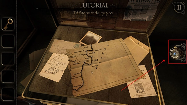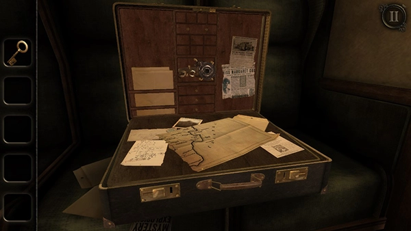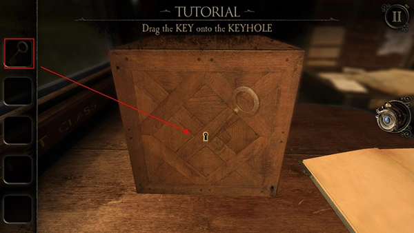2、第一个场景设定在车厢里,玩家得先查看桌上的日记本,紧接着火车会开进一段漆黑的隧道,之后桌上会出现一个木盒子,双击木盒子就能凑近它,还能拿到一把钥匙。