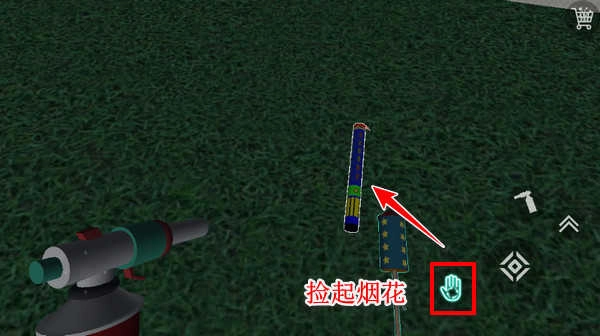 4、进入地图后,现在正式教大家如何操作烟花模拟器。屏幕左侧用于移动,右侧的按钮分别对应捡起烟花、摆放烟花、拿出点火器点火以及跳跃功能,此外右上角还有烟花商店的按钮。