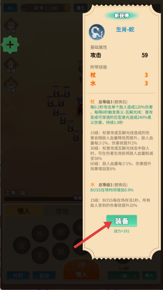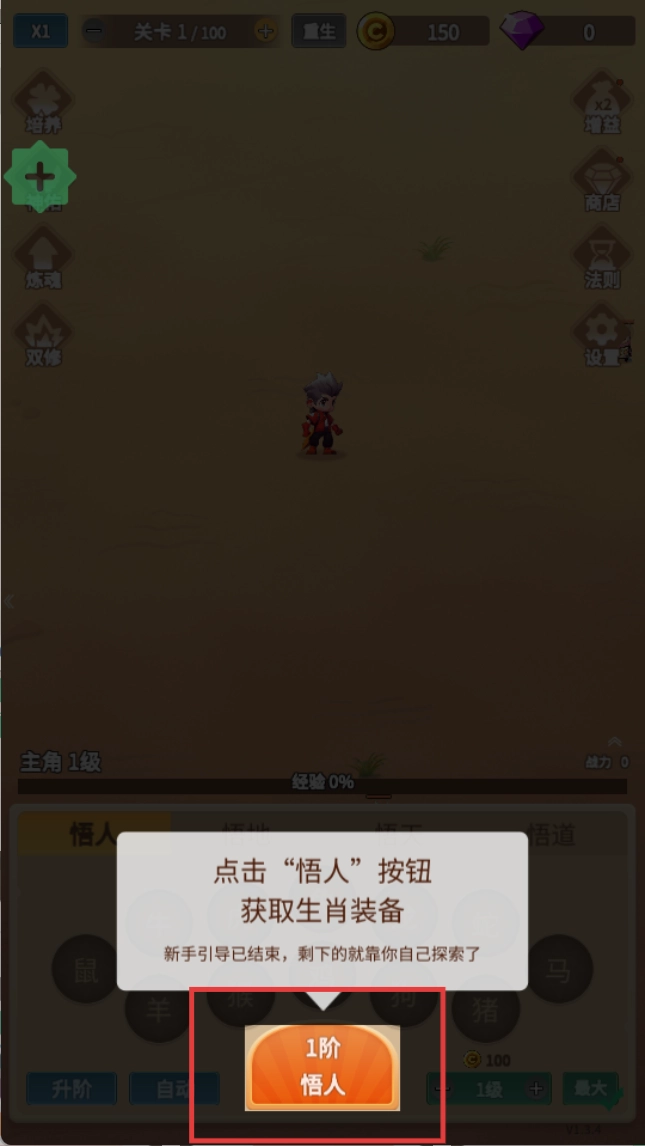 点击【1阶悟人】按钮,领取生肖装备,开启游戏探索之旅。
