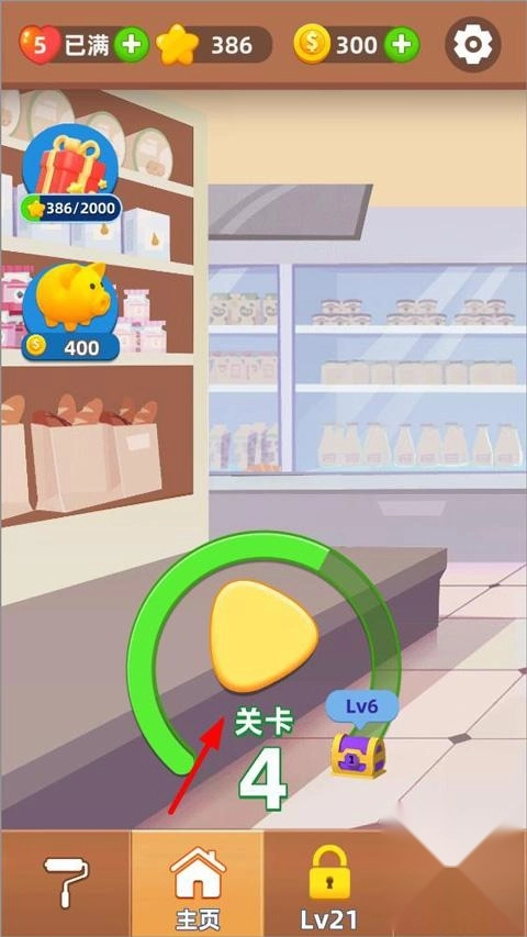 1、玩家启动游戏后进入游戏主页,在这个页面上,玩家能够查看自身的体力、金币与星星数量,点击关卡即可开启游戏;