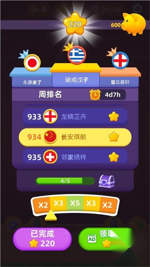 5、完成游戏后,玩家不仅能获取星星与金币,还可以查看自己本周的游戏排名。