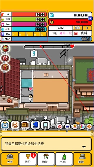 玩家得在学习之余通过打工来赚取收入,从而达成经济上的独立。