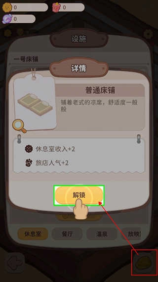 玩家接下来能进入客房,点击右下角的安全帽,进入设施页面后点击普通床铺,再点击解锁就能建造床铺,建议尽可能多解锁一些床铺。