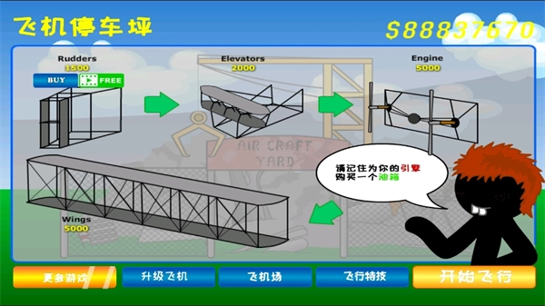 2、在飞机场区域,你可以对飞机进行升级,更换更强大的飞行引擎,并购买油箱以支持长途飞行。