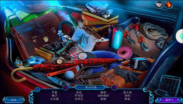 2、在这个场景里,你得找出手套、灭火器、指纹样本、手电筒、文件夹、眼镜、甜甜圈、放大镜、相机、腕表和绳索这些不同的道具。