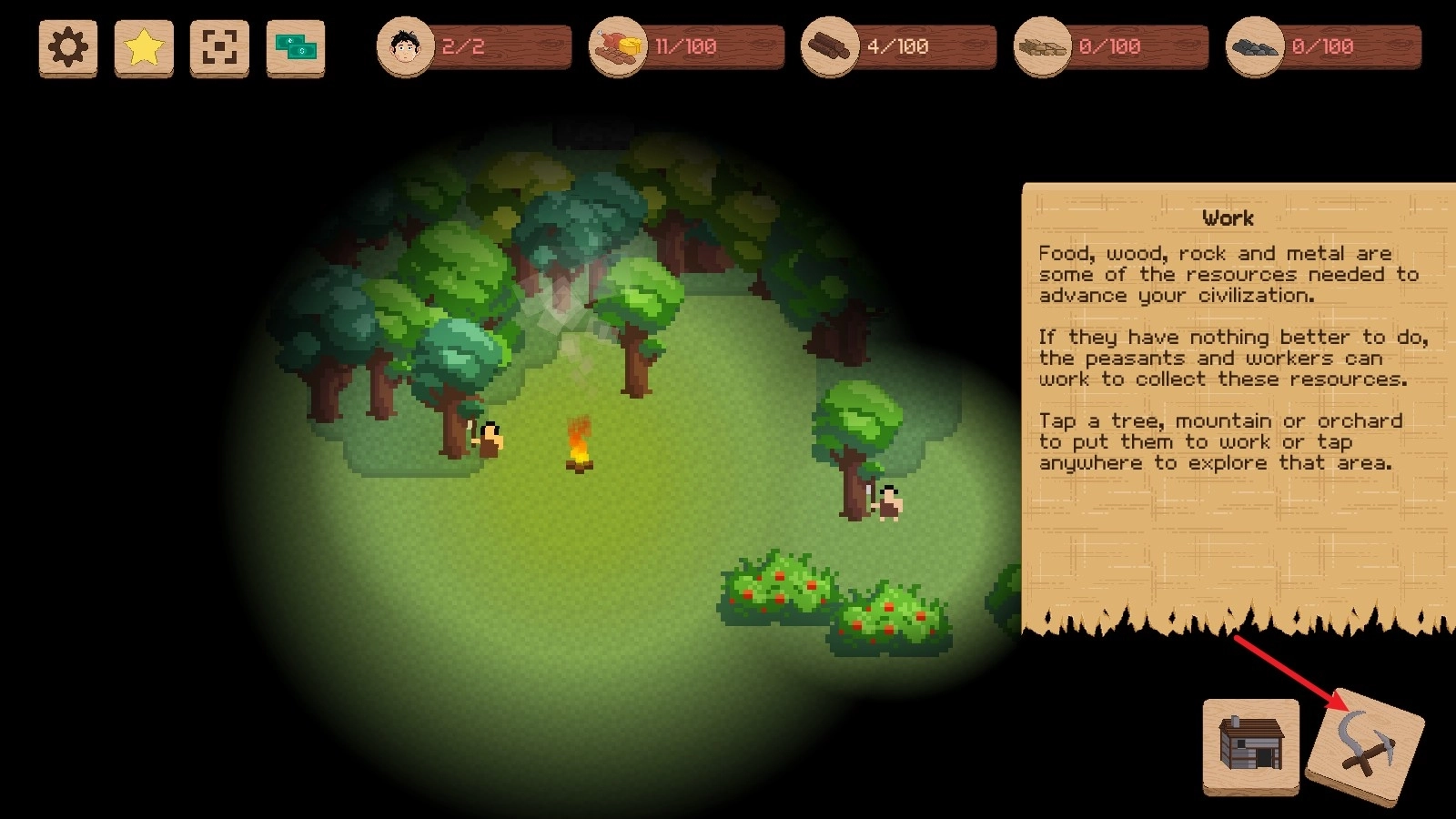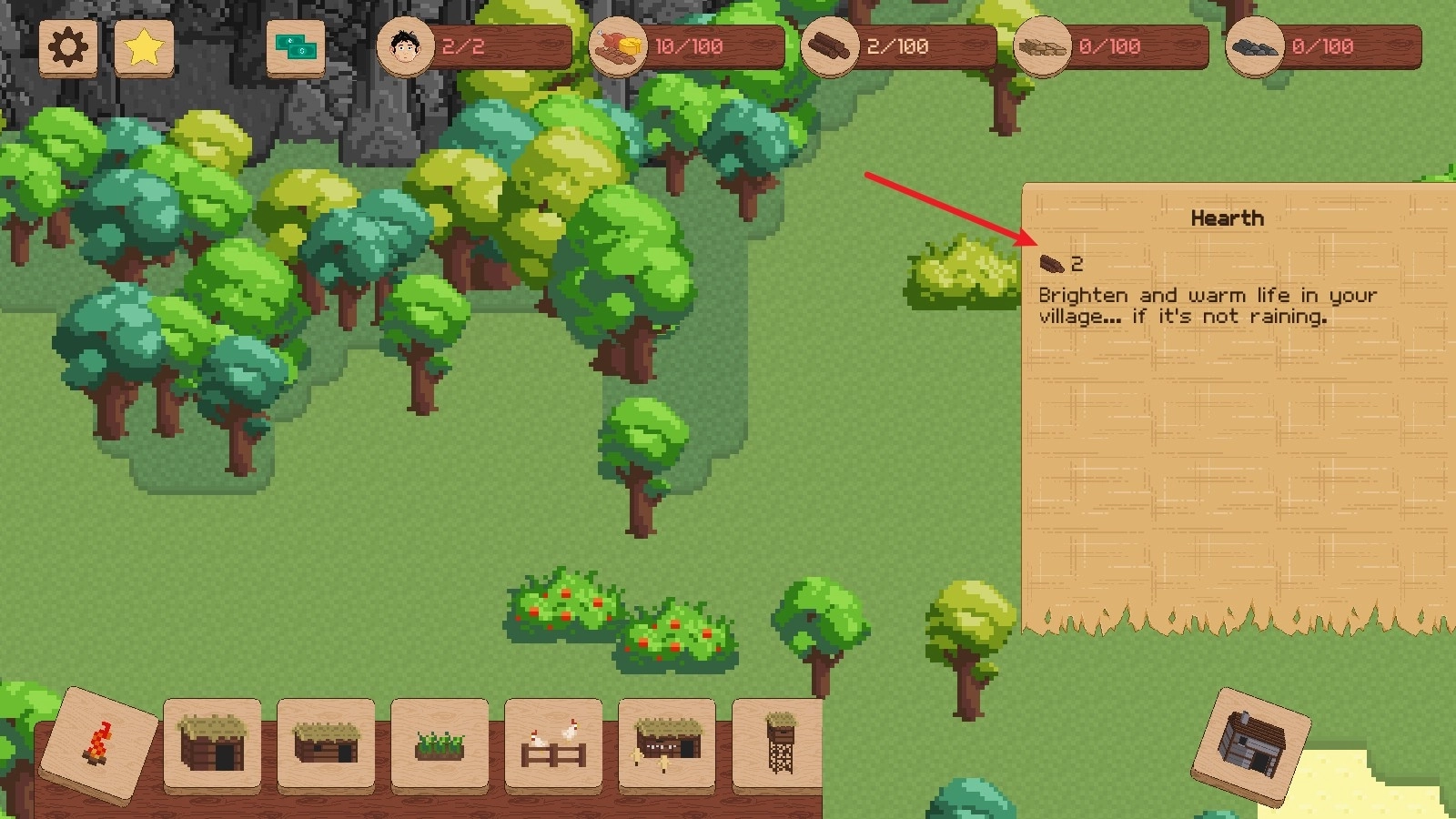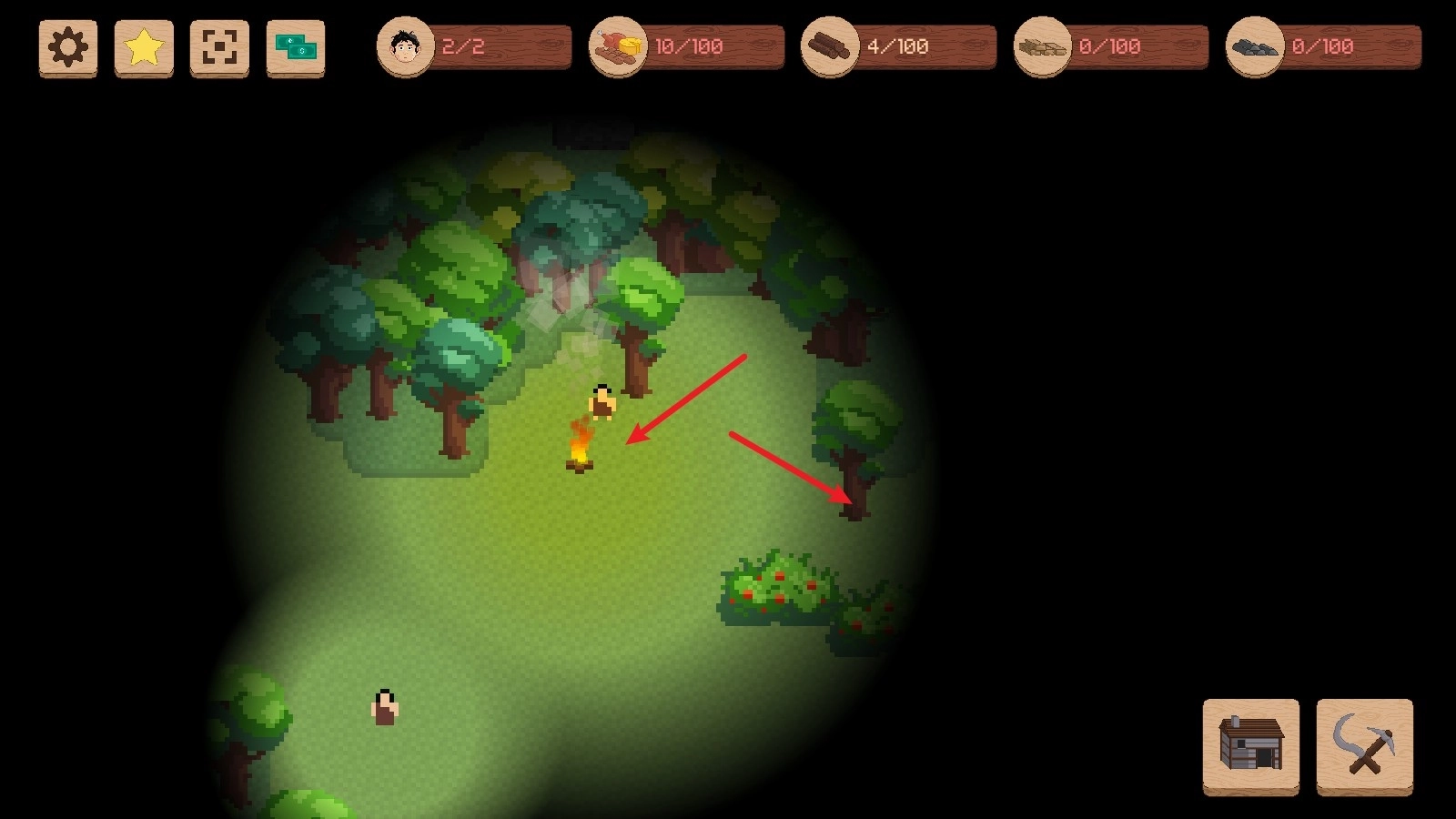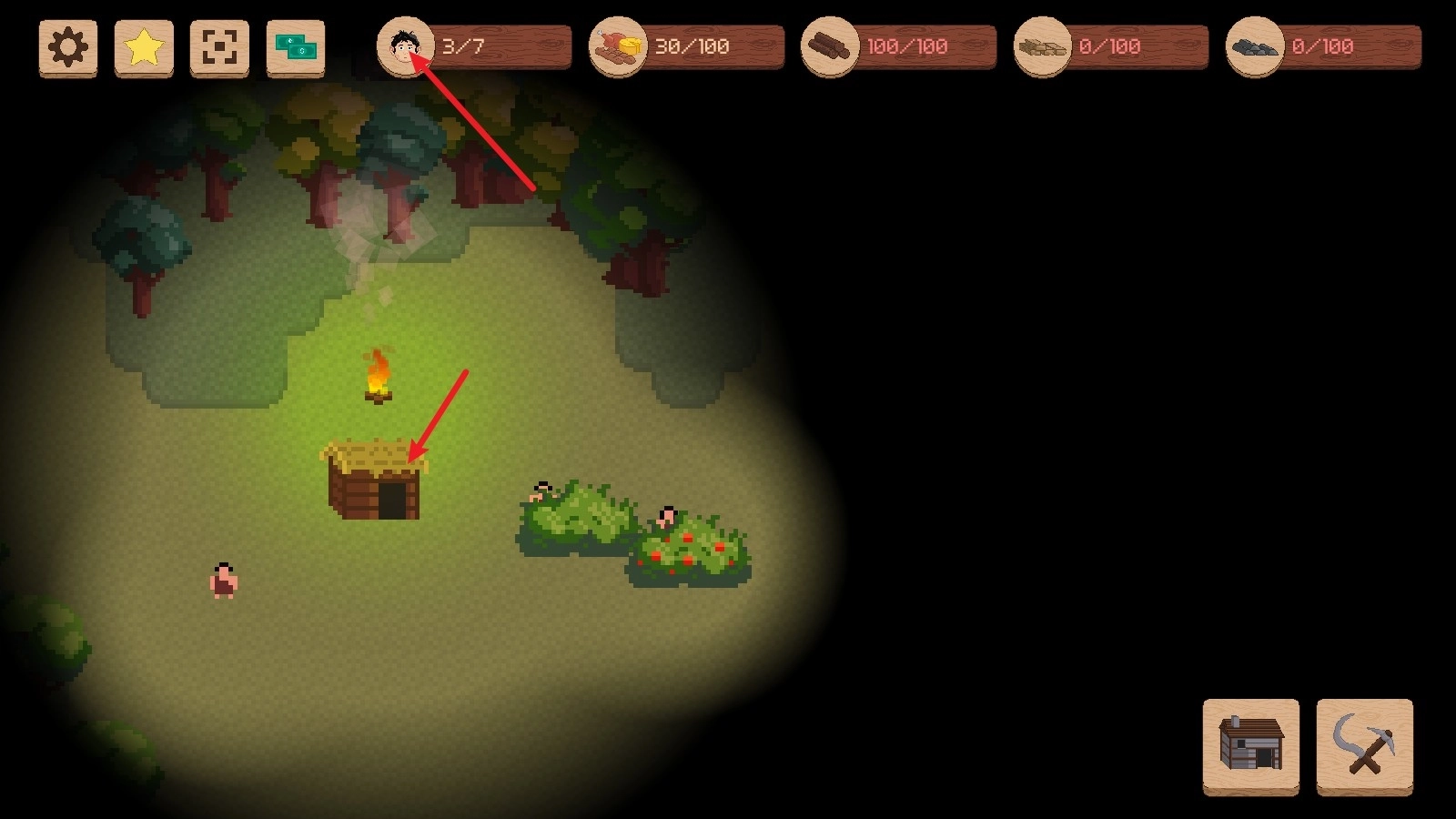6、有了足够的木材后,我们可以去建造起第一个小屋,这样就能有更多的人口了。