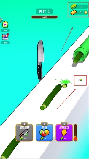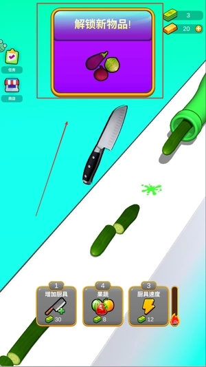 3、支持厨具升级系统,从普通水果刀到高级菜刀逐步解锁,增强切割手感与通关效率。