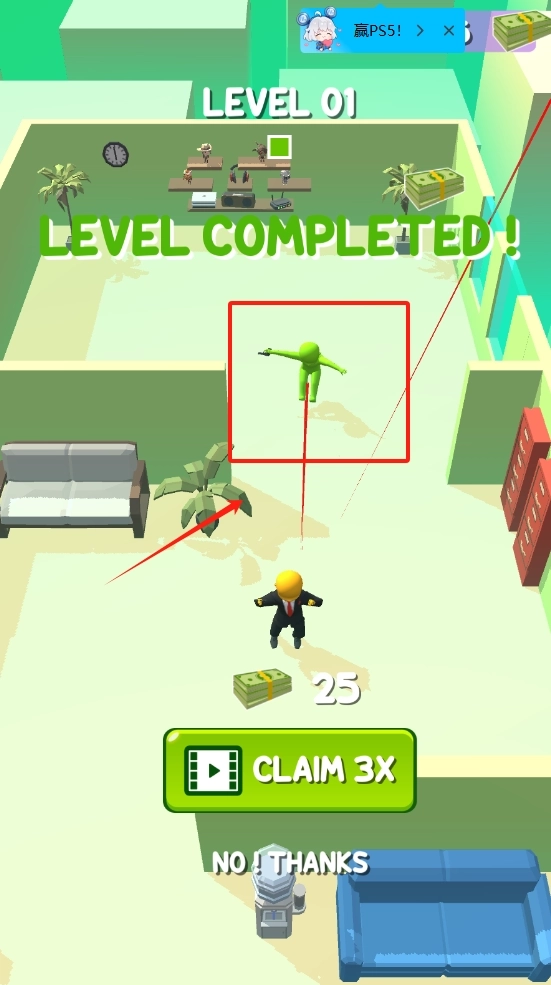 2、黑衣小人脚下有钱袋。点击绿色CLAIM3X按钮可领3倍奖励,选NOTHANKS放弃。右上角还有PS5广告和钱币图案。