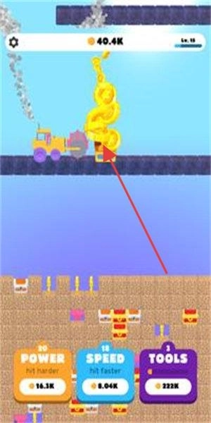 1、操控角色挖掘方块,优先挖绿色区域(如箭头指向),积累金币,可升级【POWER】等属性,增强挖掘力。