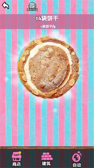 4、玩家每点击一次饼干就能制作出一块饼干,游戏中玩家可以用饼干来建造指针或是其他道具,这些物品能帮助玩家实现自动点击。