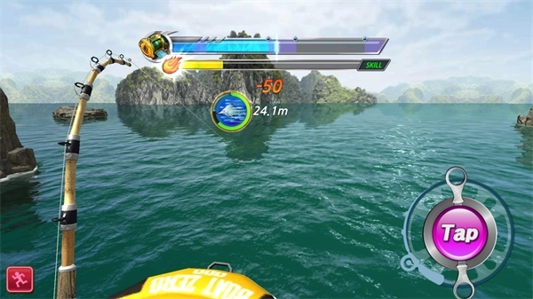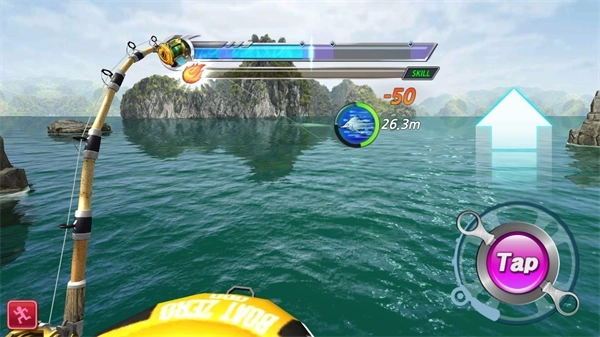 4、点击tap按钮,让上方的进度条维持在紫色区域,以此来积累能量;当能量值充满后,向上滑动屏幕就能释放技能,从而对鱼造成更高伤害,降低其血量。