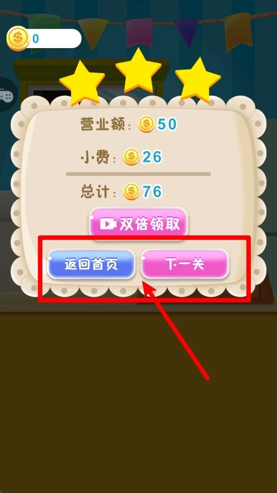 3.关卡结算页面:完成制作后会展示营业额与奖励,点击“下一关”能够继续挑战更多关卡,从而获取更多金币收入。