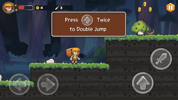 2、采用经典的操作模式,左下角的按键负责控制左右移动,右下角的按键用于跳跃和拾取金币。当你获得武器后,发射按钮便会自动显示出来。