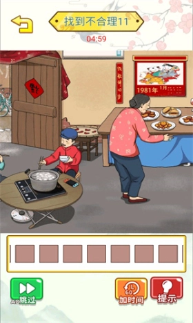 《老六找茬记》是一款需要找出游戏场景中不合理之处的游戏。游戏里每个关卡的场景都各有不同,有的设定在厨房,有的则在街道上。在这些场景中隐藏着不合理的细节,玩家可以通过点击来指出它们。完成当前关卡的任务后,就能解锁下一个级别。这些不合理之处有时是物品与时代背景不匹配,有时是场景元素之间存在矛盾,能否顺利找出全凭玩家的观察力和智慧。