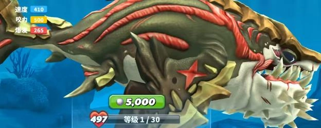 2、灾难鲨:这种鲨鱼的血量比普通MAX型鲨鱼更高,实际体验中它的爆发力明显超过数值标注的1600点。实际操作时能感觉到,普通形态的灾难鲨爆发速度也不慢,仅比古巨齿鲨稍逊一筹。开启技能后爆发速度会变快,但技能结束后数值会恢复原状,咬合力则始终保持999。
