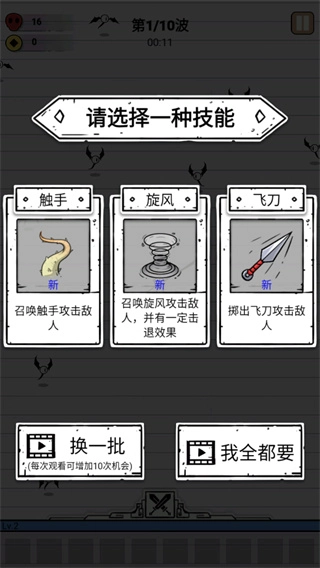 3、每一轮升级都会给出三个强力技能供选择,你可以自由搭配组合,打造出属于自己的独特战斗风格;