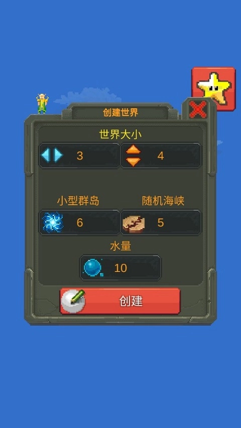 2、点击白色图标即可进入创建世界的选项界面,在该界面中,你能够对地图尺寸、岛屿类型、水域面积等各项参数进行自定义设置。